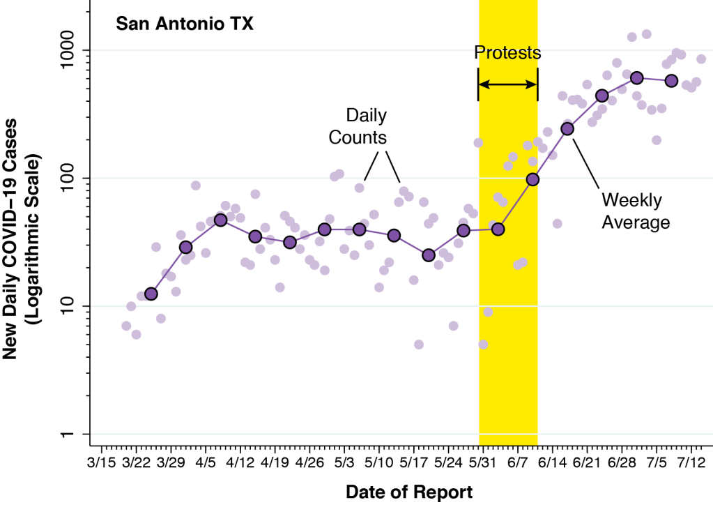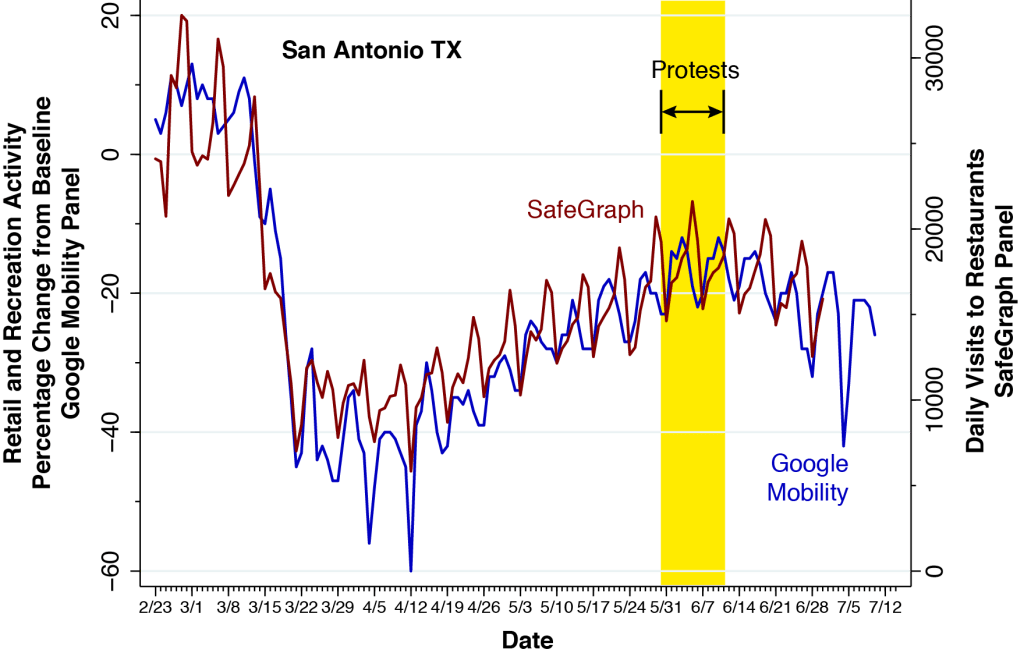 While it is difficult to line up the dates precisely, the gap between the two counties in the index of visits to bars tracks the corresponding gap in the COVID-19 incidence. To interpret the relationship between the two graphs, one needs to understand that the two measured phenomena involve very different time constants. The number of visits to a bar on a given day can abruptly turn on a dime. The resulting change in COVID-19 incidence will take at least two weeks to play out, and even longer when one considers secondary spread.