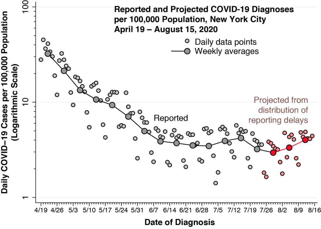 New York’s “numbers are spiking because our testing capacity is going up,” said Gov. Andrew Cuomo in a March 14 press briefing. In fact, the upswing in cases seen in the first two weeks was entirely consistent with a massive epidemic, and not simply an artifact of increased testing. That Saturday marked the first coronavirus-related death in New York City, an 82-year-old woman admitted to Brooklyn’s Wyckoff Heights Medical Center on March 3. Given the estimated mean incubation period of 5 days, the patient was likely infected on or around February 27. With an estimated infection fatality rate of about 1 percent, that one death would imply a hundred coronavirus cases in the city by the end of February alone. If anything, the testing-confirmed case counts in the first week of March significantly understated the actual epidemic growth curve.