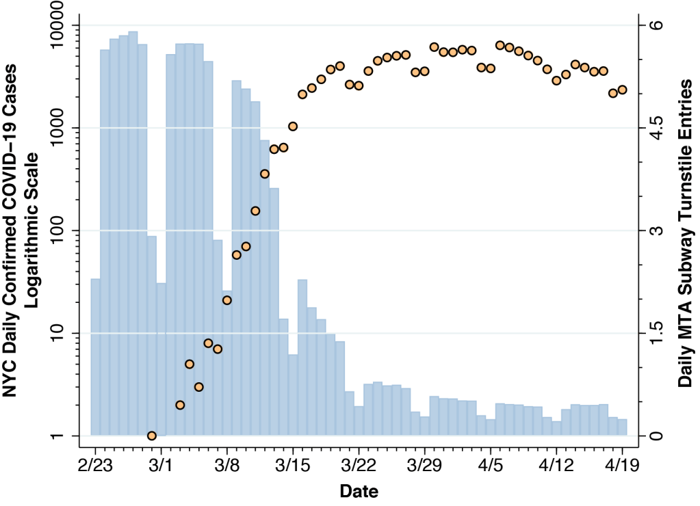 Figure 1 superimposes two time series. The mango-colored data points show the numbers of daily confirmed COVID-19 cases reported by the New York City Department of Health and Mental Hygiene. The case counts are measured on a logarithmic scale at the left. The sky-blue bars show the daily volume of trips on the city’s subway system, computed from the Metropolitan Transit Authority (MTA) turnstile data. The counts of turnstile entries are measured on a linear scale on the right-hand axis. While the computation of total subway usage entails some big-data programming, the patterns in the figure are consistent with other estimates.