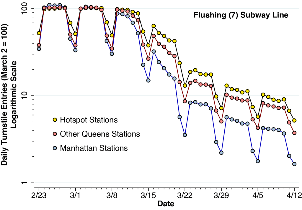 By the third week of March, the counts of new cases in different boroughs began to diverge, with less dense Queens reporting more than twice as many daily cases as Manhattan. By the end of March, a cluster of high-incidence zip codes in the Queens-Elmhurst area had been identified. While daily rider volume at the Manhattan end of the Flushing Local (Number 7) subway line dropped early and precipitously, turnstile entries into the stations within the high-incidence zip codes (the hot zone) declined more slowly and to a significantly lesser extent.