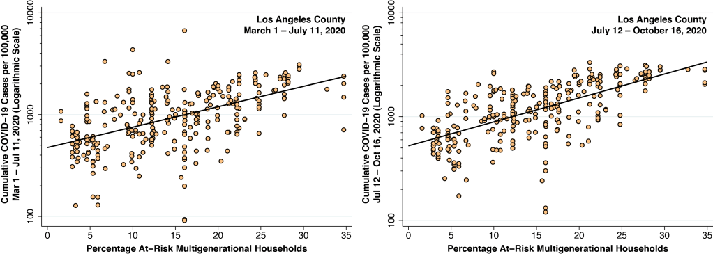 Figure 4 repeats the same analysis, covering the cumulative incidence of new cases during Phase IV, from October 17 though November 26. Once again, there is a significant positive relationship across communities between the prevalence of multi-generational households and the incidence of new infections.