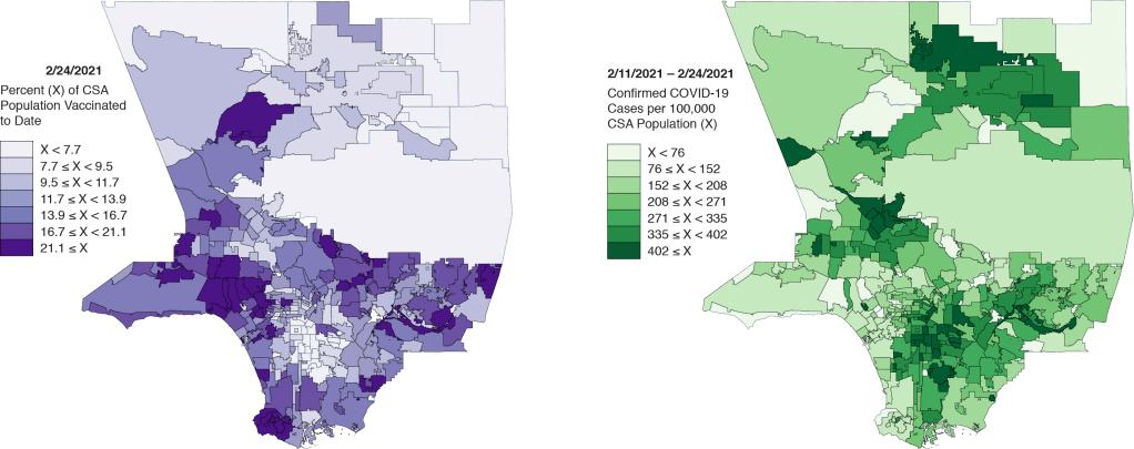 The Los Angeles Times recently posted two maps in an attempt to demonstrate the striking inequities in the COVID-19 vaccine rollout in Los Angeles County, far and away the largest county by population in the United States. One map showed the geographic distribution of vaccines to date, while the other showed the corresponding distribution of recent COVID-19 cases throughout the county.