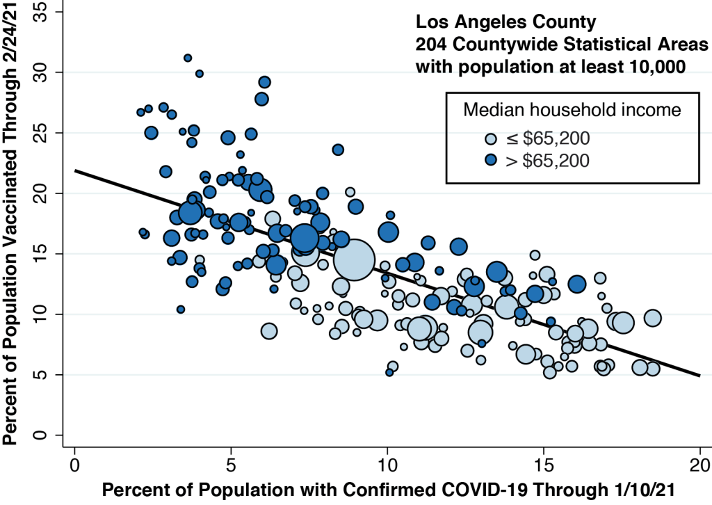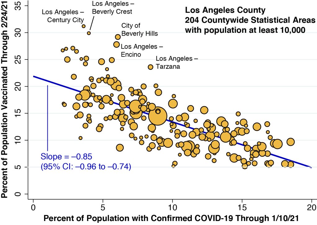 In Figure 2 above, we’ve plotted the percentage vaccinated in each community against the cumulative number of confirmed COVID-19 cases in that community. We’ve restricted our plot to the 204 communities within Los Angeles County that have a population of 10,000 or more. (Technically, these communities are called countywide statistical areas, or CSAs.) The size of each data point corresponds to community’s population. Strictly speaking, the horizontal axis measures the cumulative proportion of individuals who ever had a confirmed case of COVID-19, while the map at the right in Figure 1 shows the geographic distribution of recently confirmed cases. Still, the two variables are highly correlated.
