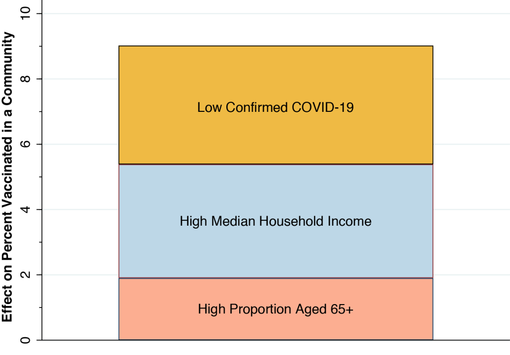 Our results in Table 1 give us a reasonable idea of the magnitudes of the effects involved. A community with a low percentage of confirmed COVID-19 cases, with a high median income and a high proportion of elderly persons would have a vaccination rate 3.64 + 3.48 + 1.90 = 9.02 percent greater than a community at the other extreme. That’s the height of the bar in Figure 5 below, which shows each of our three estimated effects stacked atop one another. With a median vaccination rate of 13.1% to date, a combined increase of 9.02% is no small effect.