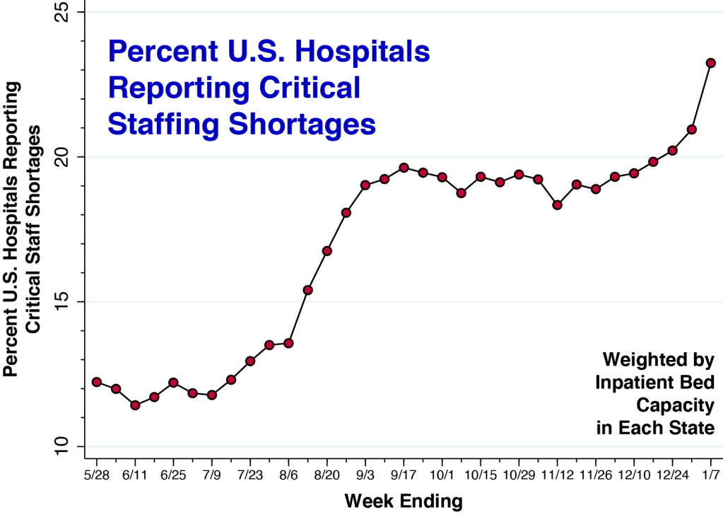 To determine each data point in the figure, we first ascertained the percentage of hospitals in each state reporting a critical staffing shortage, as reported by the Department of Health and Human Services. We then computed the weighted average across all states, where the weights were each state’s inpatient bed capacity. During the week ending January 7, 2022, we’ve thus calculated that 23.2 percent of all U.S. hospital beds were located in a hospital reporting a critical staffing shortage.