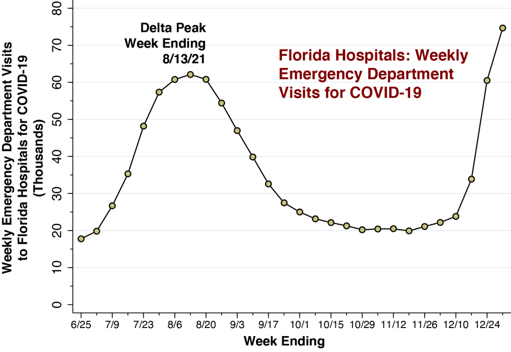 Hospital ED visits for COVID-19 approached 75,000 during the week ending 12/31/21, overtaking the Delta peak of 62,100 during the week ending 8/13/21.