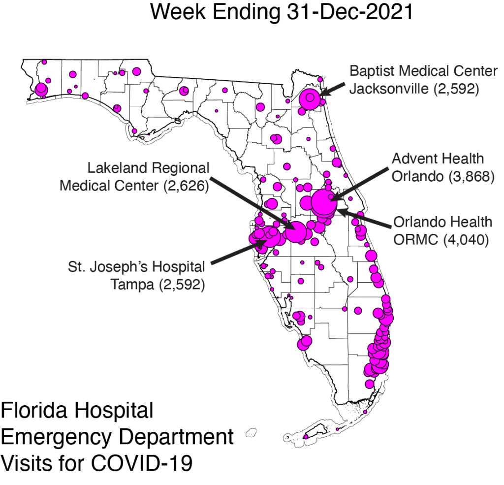 As an indicator of the evolution of Omicron in the state, ED visits for COVID-19 do have their own potential biases. Florida has a notably high concentration of uninsured individuals, who may preferentially seek the ED simply to get tested. Large hospitals with emergency departments may serve wide geographic areas. Residents from outside Orange County may travel to the two Orlando-based hospital EDs identified in our map.