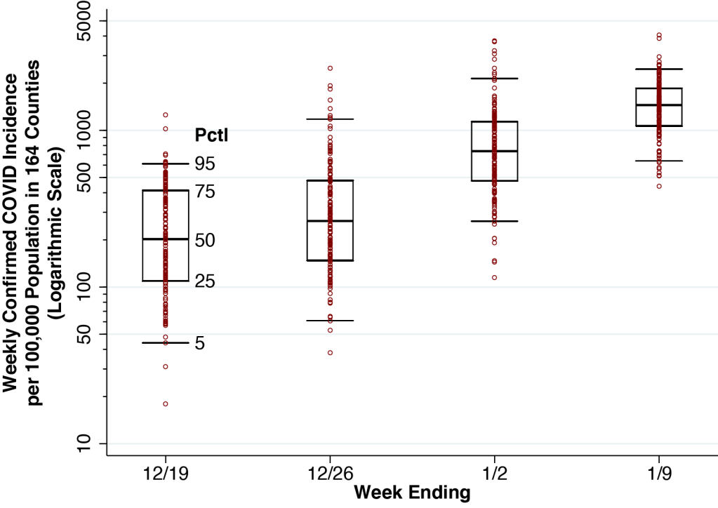 Whiskers-on-Box Plots of Weekly Confirmed COVID Incidence per 100,000 Population in the 164 Counties Containing the 250 Study Hospitals, Weeks Ending December 19, 2021 Through January 9, 2022. For each week, the 5th, 25th, 50th, 75th, and 95th percentiles are superimposed upon the individual county-specific datapoints. A total of 11 datapoints with zero incident cases are omitted from the first two weeks. Source: https://www.medrxiv.org/content/10.1101/2022.01.22.22269700v1